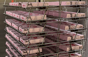 食品用X線装置を用い、赤福餅の中に硬質の異物が入っていないかを精査します。異常を検出した製品はラインから自動的に排出され包装されません。